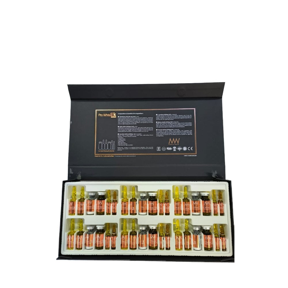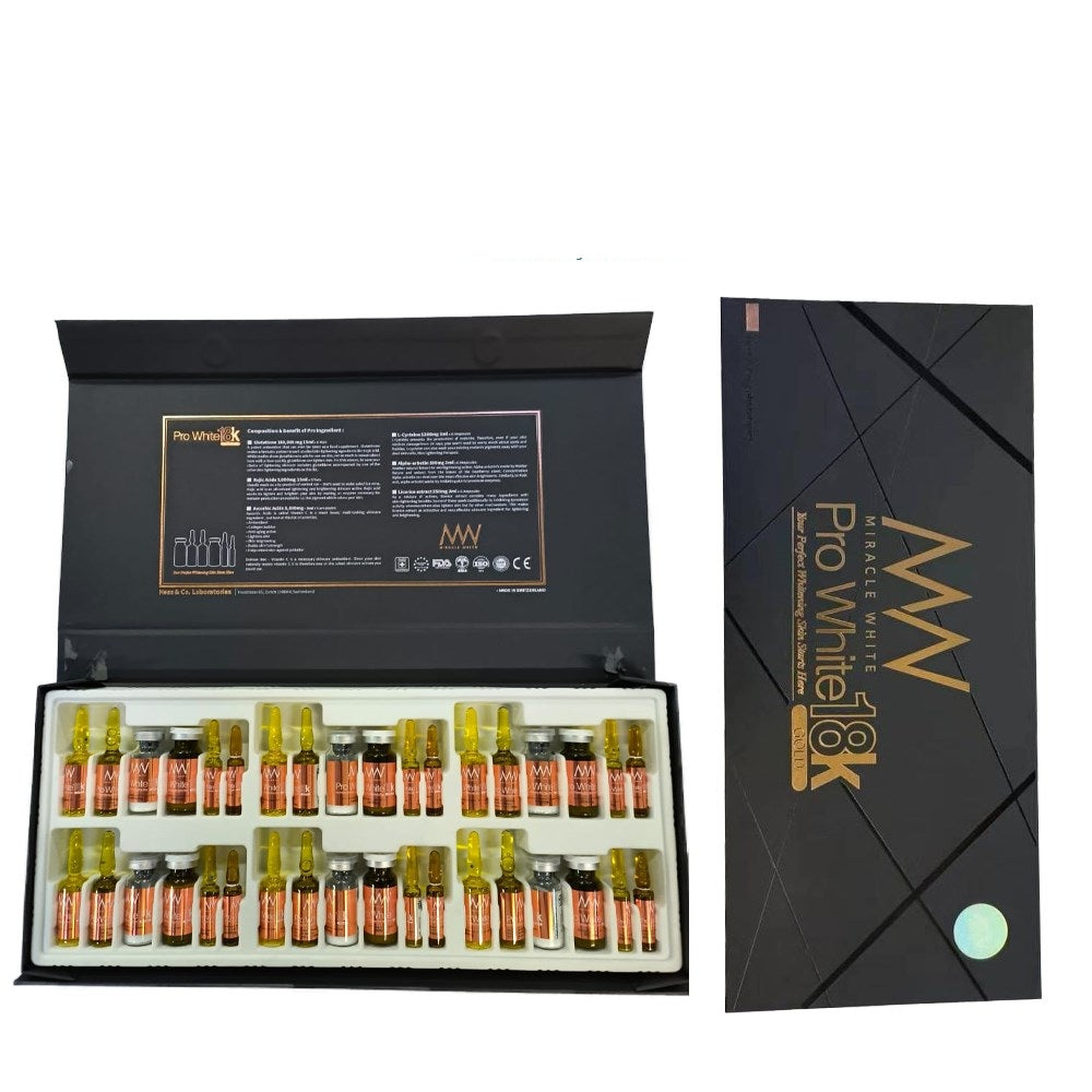 Miracle White® Pro White 18K Glutathione Injection delivers a powerful blend of nutrients designed to rejuvenate and brighten the skin. Each 15ml vial contains a high-strength formulation of Glutathione (180,000 mg), a potent antioxidant, alongside other key ingredients that work synergistically to enhance skin health.